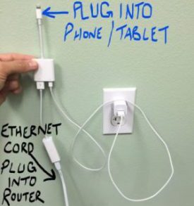 ***If you plug in the adapter to your iOS device before hooking up to the power/outlet, you will get a message on your iOS device saying: “Cannot Use Device; Apple USB Ethernet Adapter : The connected device requires too much power.” Once hard wired to the wall, this will go away and you will be able to use your tablet or smart phone online with no wireless signal required, or even better, you can cut the 4G or 5G and have it in airplane mode.